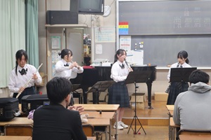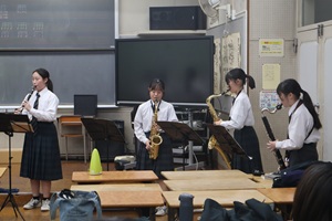 アンコン県大会リハーサル 2025年12月12日 最終更新日時 : 2025年12月12日 kumagaya_edit 本日の放課後、明日のアンサンブルコンテスト県大会のリハーサルを音楽室で行いました。多くの職員が見守る中、木管八重奏で「幽玄の花」を演奏しました。素晴らしい演奏です。自信をもって、明日の本番に臨んでください。
