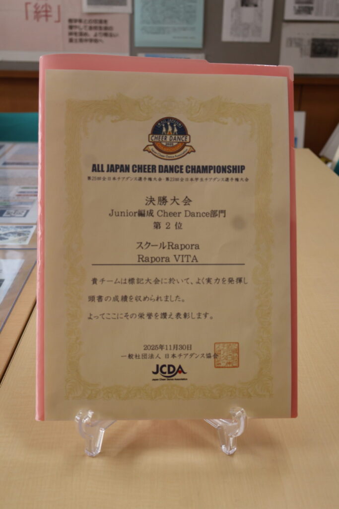 先月30日に開催された第25回全日本チアダンス選手権大会・第23回全日本学生チアダンス選手権大会・決勝大会のJunior編成Cheer Dance部門において、チームRapora VITA が全国第2位という素晴らしい成績をおさめました。昨年度は第3位でしたので、順位を一つ上げたことになります。先週の表彰集会でも少しお話をした通り、大会のステージ上の演技動画をみることもできました。チアダンスは想像以上にすごいです。息もぴったりで迫力もありました。相当な努力を重ねたことがわかります。