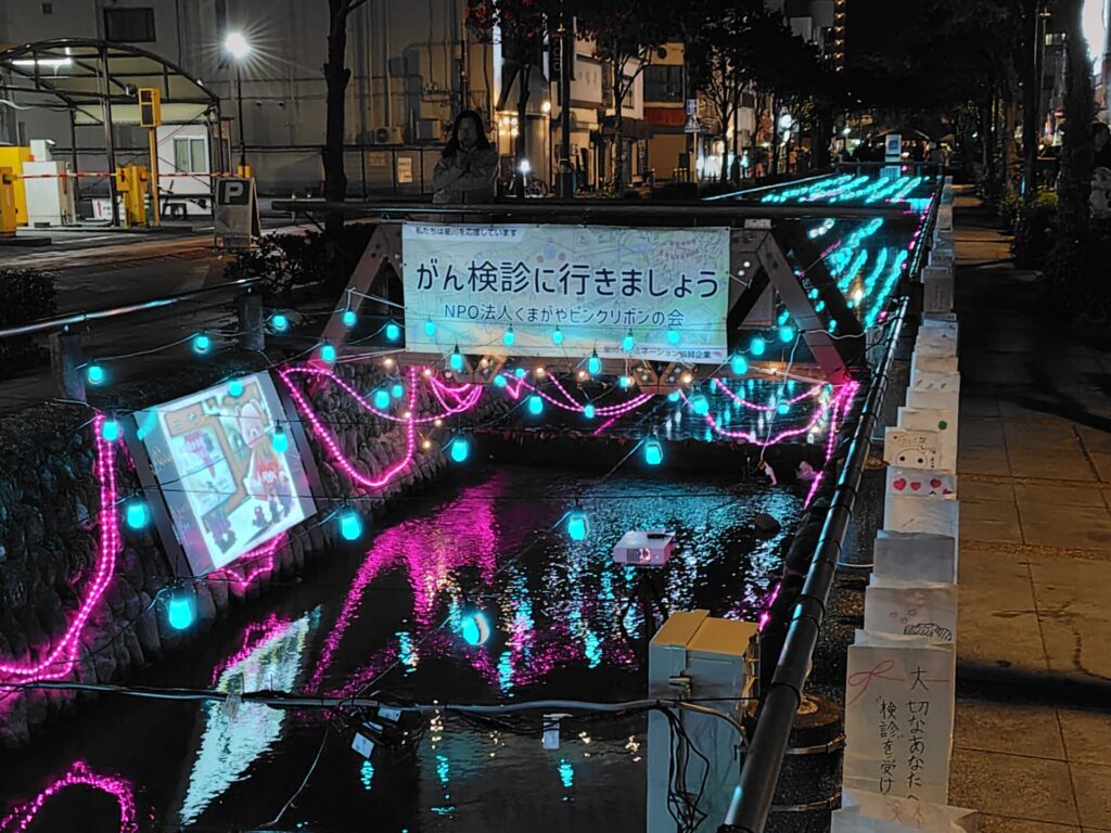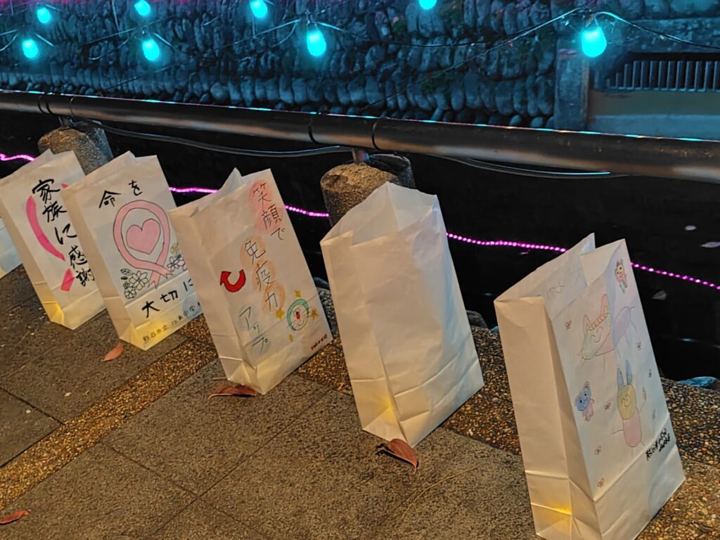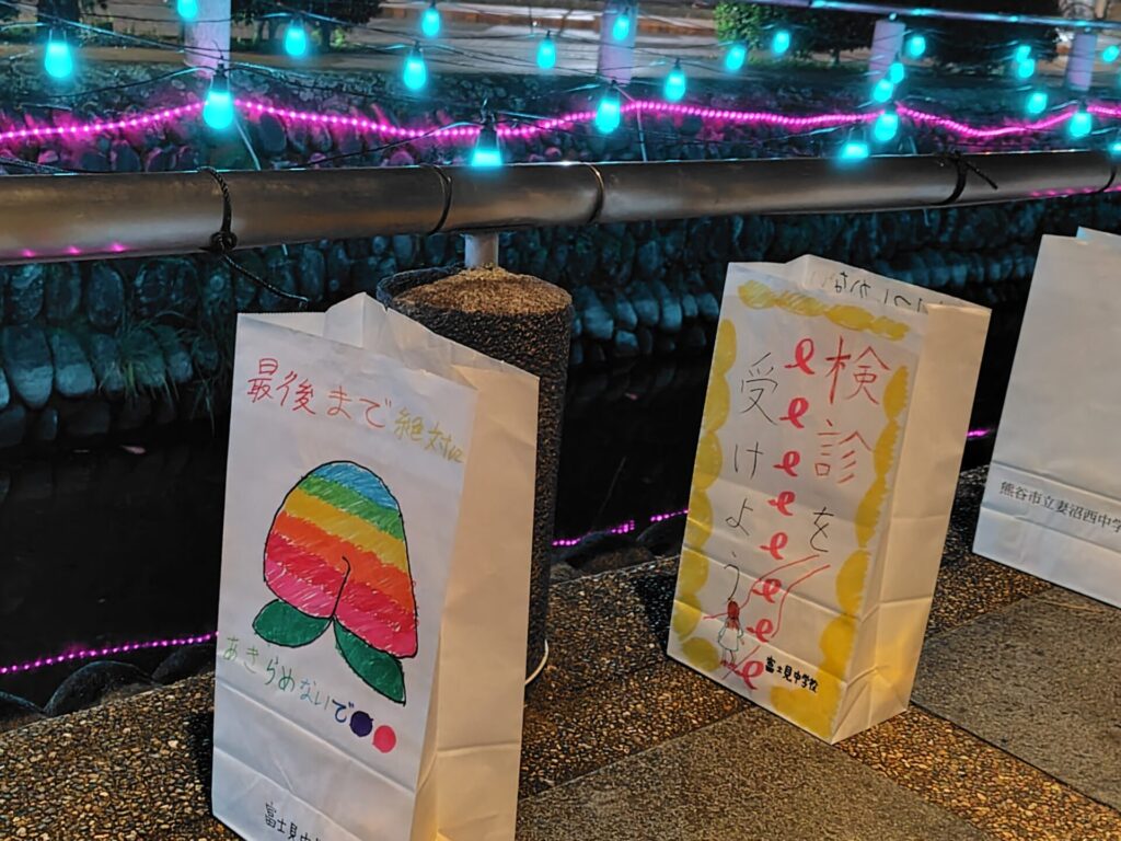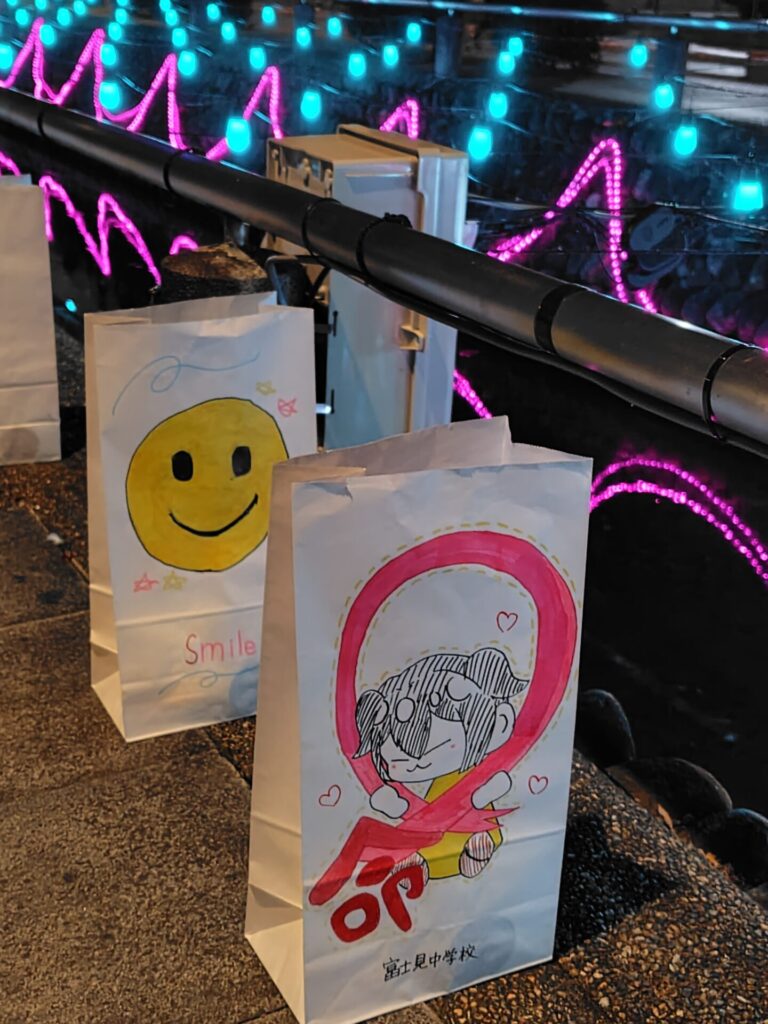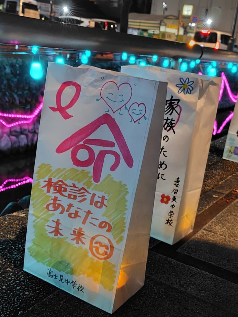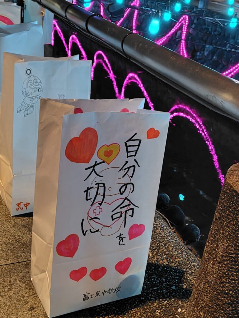 本日、星川で子宮頸がん予防啓発のためのイルミネーション点灯式が行われ、市内16校の中学校で作成したルミナリエバッグが点灯しました。本校では2年生の保健委員がルミナリエバッグを作成しました。検診をよびかけたり闘病されているご本人や御家族を応援したりするメッセージが夜の星川に灯りました。