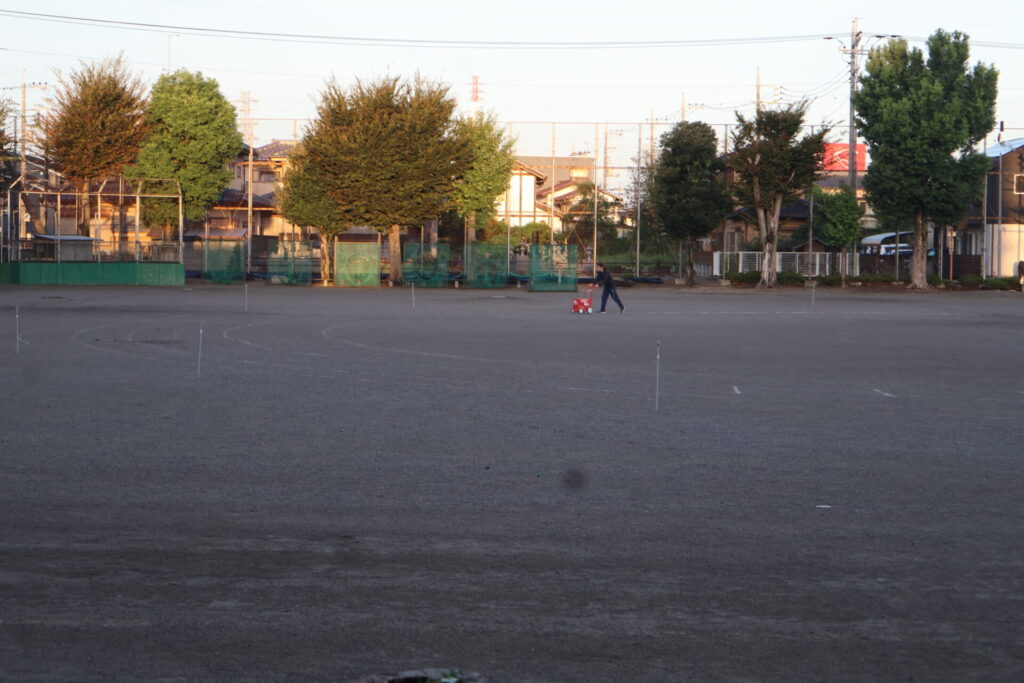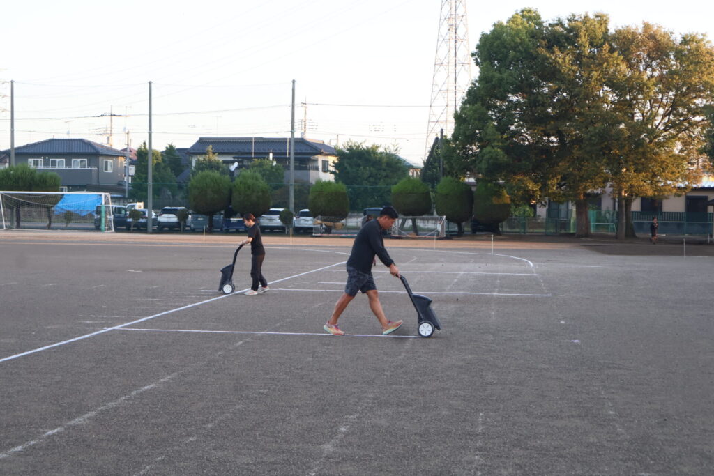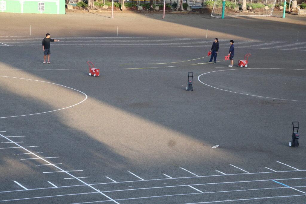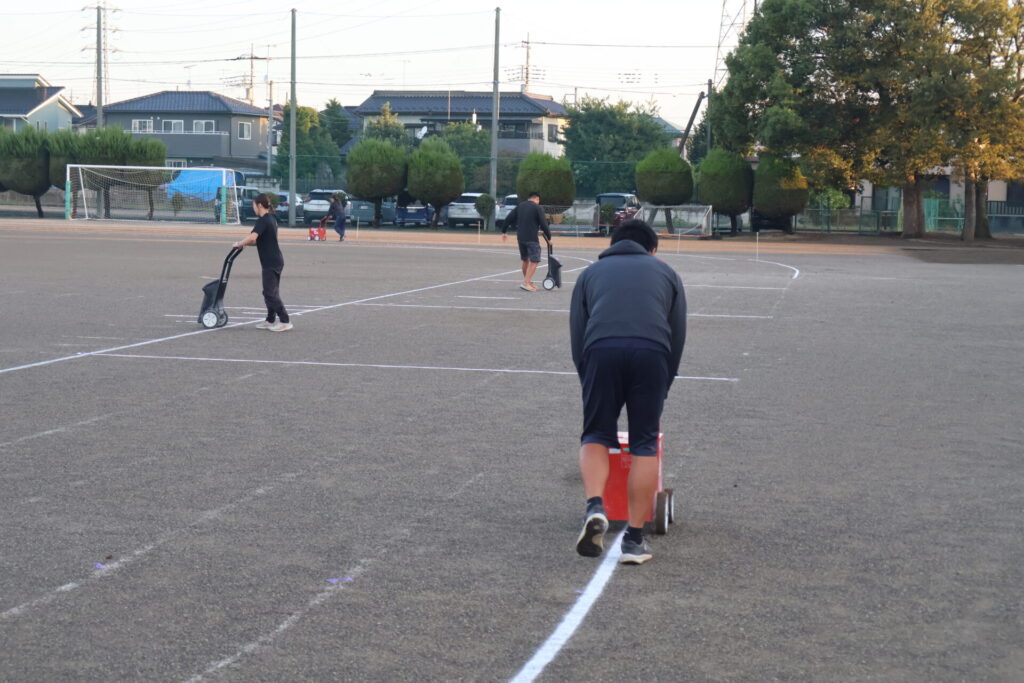 「判定」時刻の午前6時前には、体育部の職員も集合し、昨日は雨が降っていたため実施できなかったライン引きを始めました。その後、早くに出勤してきた職員も手伝っていきます。7時30分に準備の生徒が登校することになっていますが、その前に下準備を少しずつ進めているところです。
