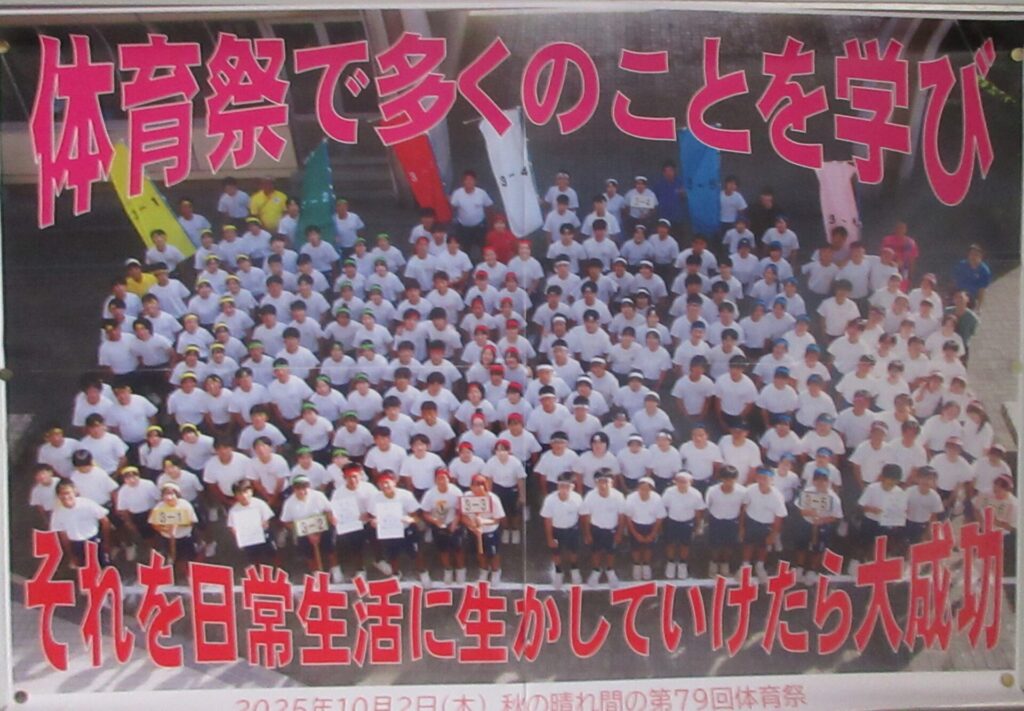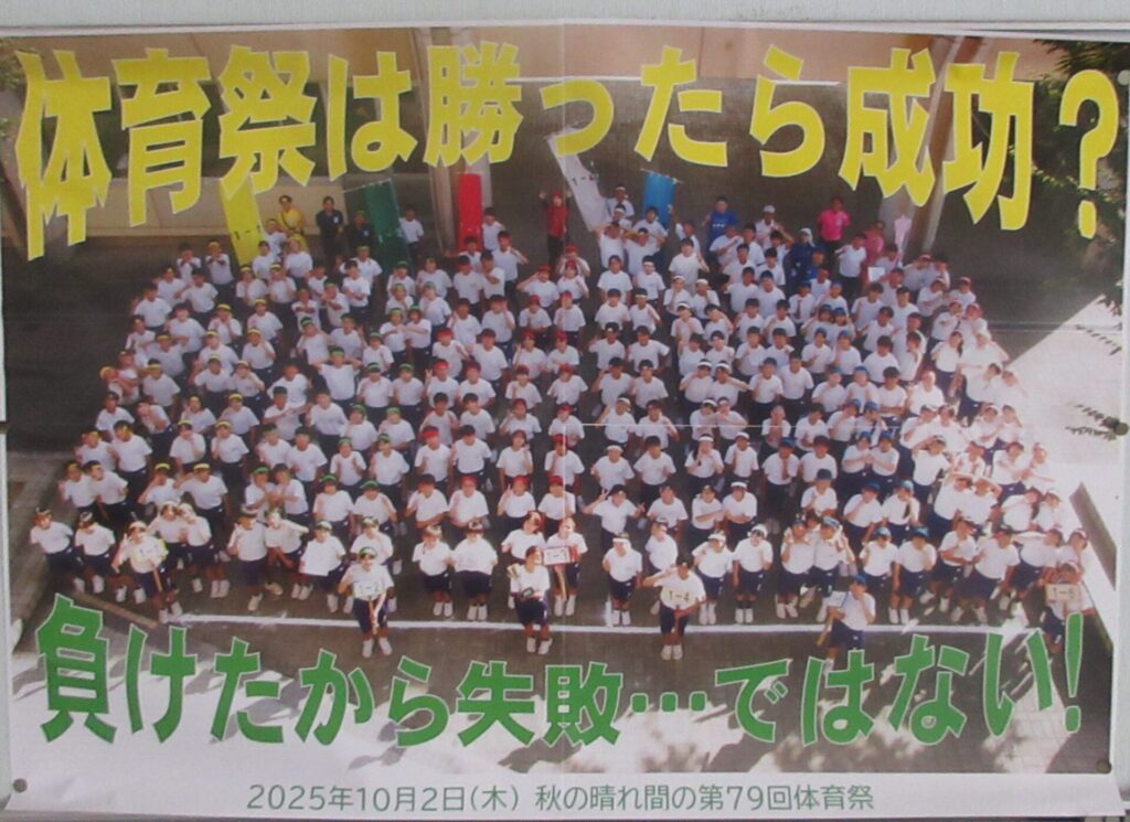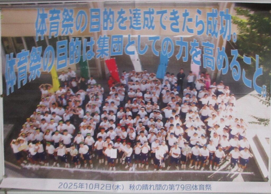 体育祭の閉会式の講評で、「体育祭を通しての学びや成長を日頃の学校生活、学校行事につなげていきましょう」とお話をしました。体育館に向かうフジミチの左側に、体育祭終了後に撮った各学年集合写真が掲示されています。その写真には次のような言葉が添えられています。「体育祭は勝ったら成功? 負けたら失敗・・・ではない!」「体育祭の目的は達成できたら成功 体育祭の目的は集団としての力を高めること」「体育祭で多くのことを学び それを日常生活にいかしていけたら大成功」。