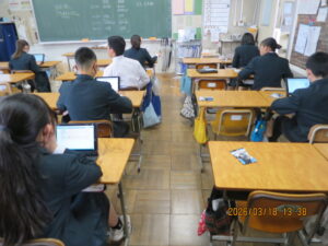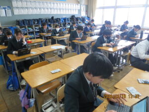 全国学力・学習状況調査が、4月~5月にかけて実施されます。それに先立ち、英語の話すこと調査の事前練習が行われました。学級の半分の人数分、教室にスペースを空け、イヤフォンマイクに向けて声で解答します。順調に事前練習は済み、当日に向けてよいスタートが切れました。