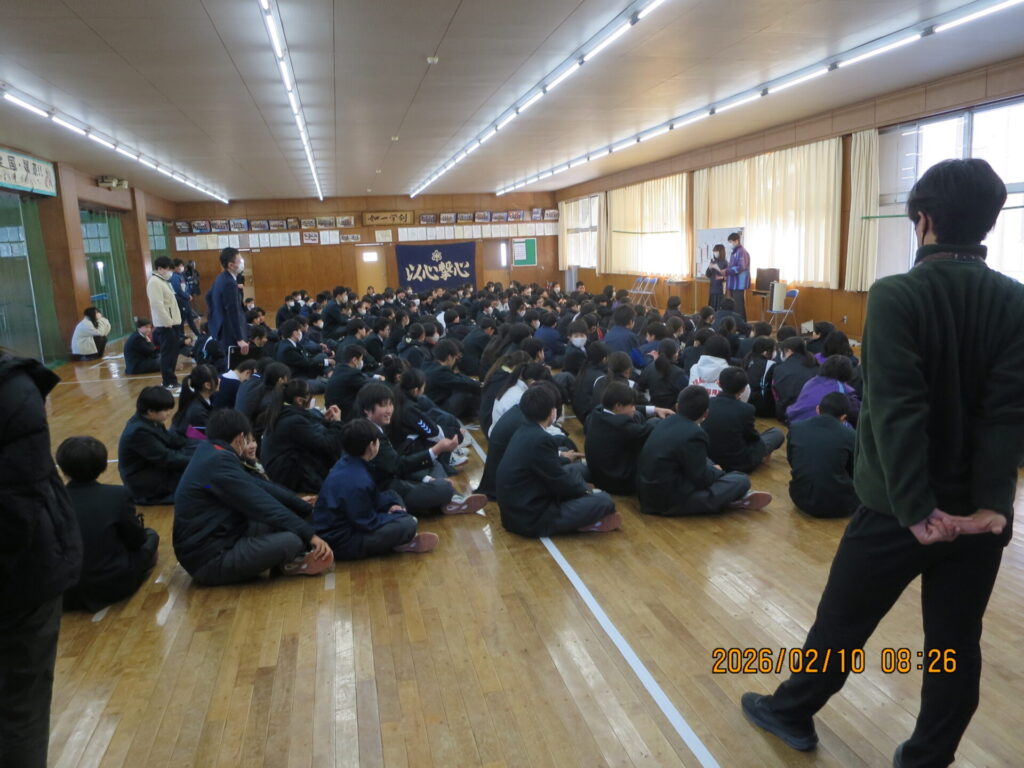 1,2年生が学年朝会を実施しました。1年生は3年生を送る会の準備、2年生は1年間の学年の振り返りをクイズ形式で行っていました。どの学年も1年のまとめを少しずつ進めています。3年生は受検まであとわずかです。今年度の締めくくりを進め、明るい未来に進んでほしいと思います。