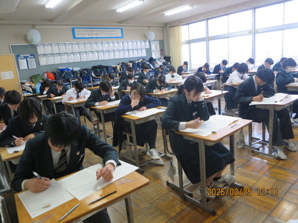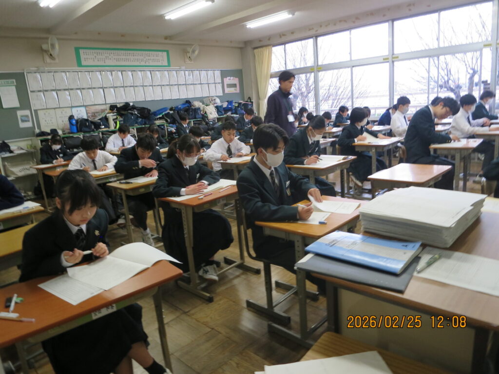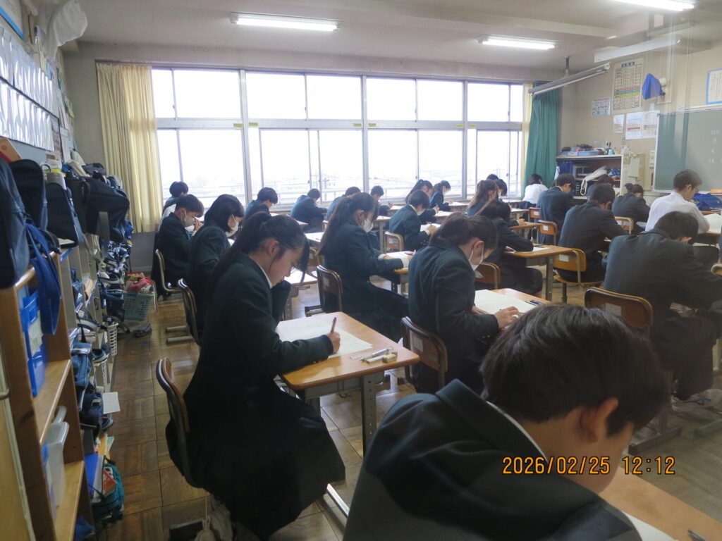 後期期末テスト 2026年2月25日 最終更新日時 : 2026年2月25日 kumagaya_edit 本日から3日間、1・2年生が今年度最後となる後期期末テストに臨みます。今日は1日目、技能科のテストでした。日ごろの学習の成果を発揮してください。頑張れ!富士見中生!