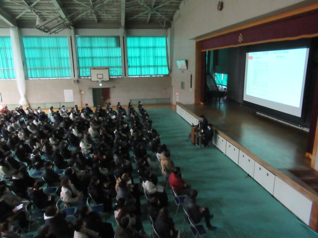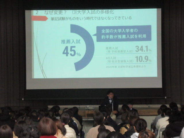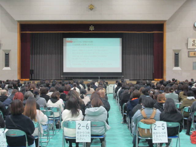 5時間目の授業参観後に、令和9年度以降(現2年生以降)の公立高校入試制度についての説明会を実施しました。1,2年生の保護者の皆様は体育館で、生徒は各教室(オンライン)で、進路担当の先生の説明を聞きました。内容は「変更点の概要」「なぜ変更するのか」「変更点の詳細」でした。