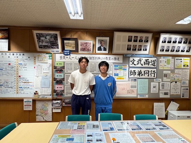 まずは、県予選会を振り返りました。決勝の対戦チームは、学校総合体育大会県大会決勝と同じ熊谷合同でした。手強い相手です。決戦前、主将のフォラウさんは「絶対に勝つ」という強い気持ちで試合に臨むよう仲間に檄を飛ばしたそうです。今回に限らず、フォラウさんは試合前にはいつも、仲間を鼓舞する強いリーダーシップを発揮しています。頼もしい主将です。試合に勝ったときには、「最高にうれしかった」と副将の松原さんは話してくれました。3年生にとっては集大成となる大会ですから、勝利にかける思いも強かったのだと思います。2人がラグビーを通して学んだことは、団結することや自分の役割を果たすことの大切さなのだそうです。それは、今後に生きる大切な学びです。新人体育大会の県大会も昨日スタートしたところです。この大会の主力は2年生です。新チームに伝えたいこととして、フォラウさんは「チーム全体で戦うことを忘れるな!」松原さんは「自信をもって!」という言葉をあげてくれました。ラグビー部の伝統がしっかりつながっていくことを実感しています。