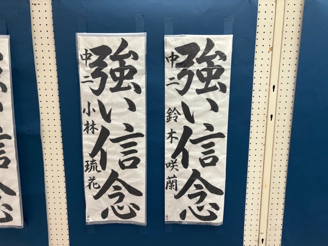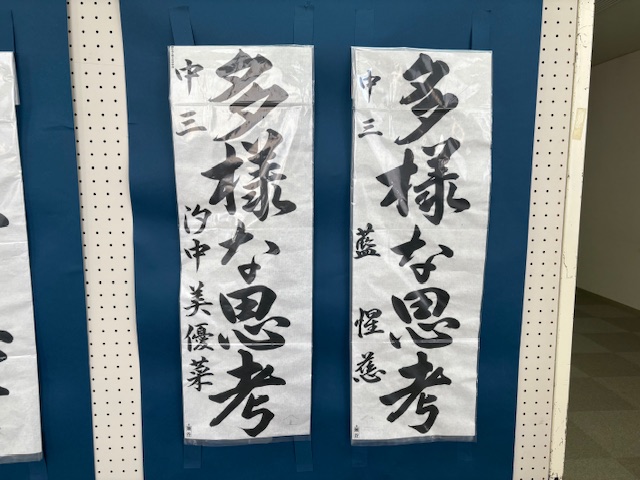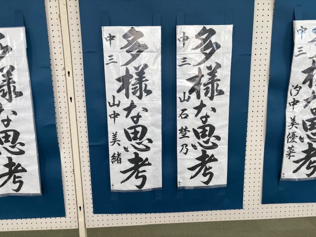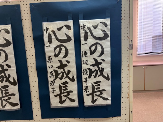 今月17日(土)18日(日)、江南公民館を会場に熊谷地区書きぞめ展が開催されました。本校からは、推薦賞をいただいた汐中さん・山石さん・山中さん(3年生)、鈴木さん(2年生)、渡辺さん(1年生)の作品が展示されました。5作品は県展に出品されます。熊谷地区書きぞめ展の入賞作品(特選・入選)は後日、校内にて展示します。
