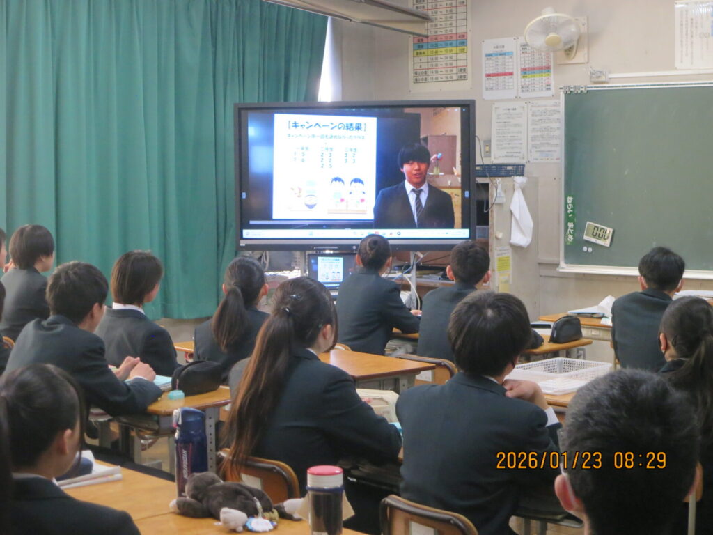 先週、生徒朝会で、給食委員会の発表がありました。食中毒にならないための調理場の衛生管理を映像で見たり、クイズが出題されたりしました。また、給食時の身だしなみや、片付けなどのキャンペーン結果のお知らせもありました。安心、安全かつ、ゆっくり食事をとれる環境を自分たちでも作っていきましょう。