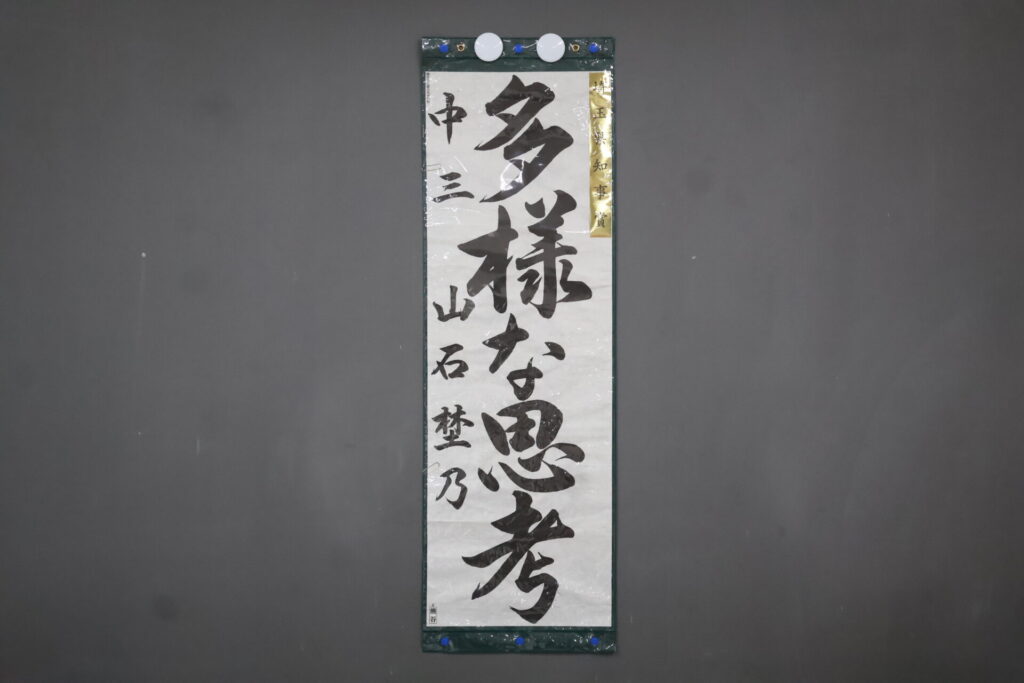 山石さんは、例年冬休みを中心に1ヶ月くらい練習に集中するといいます。多いときには、1000枚くらいは書きあげるそうです。今年は3年生で受験勉強にも力を注がなくてはいけませんから、200枚くらいの練習枚数だったと教えてくれました。本人は練習が足りなかったと振り返っていましたが、1枚書きあげるのに20分間かかるとして、何時間を練習に費やしたのか・・・本当にすごい努力だと実感します。山石さんの作品をみた榎本さんは「全体のバランスがとれていて、字と字がつながっていることがよくわかる。」と感想を伝えてくれました。
