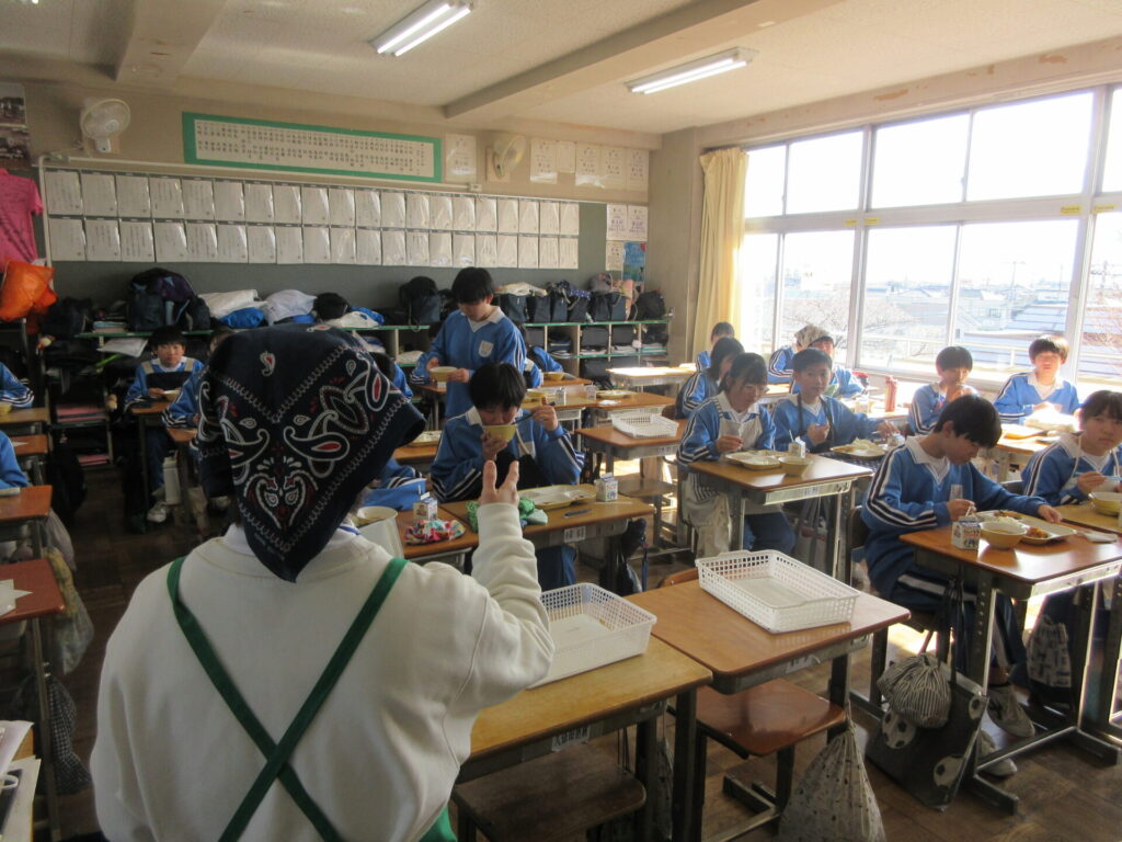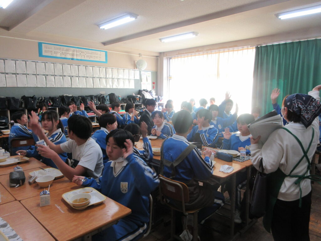 本日、給食の時間に熊谷学校給食センター栄養士の増田先生が来校されました。生徒たちに、「リクエストしたい給食があるか」、「今日の給食のスープの味の濃さはどうか」等、質問しました。毎日、色々考えて美味しい給食を提供してくれていることに感謝しこれからも給食をいただきましょう。
