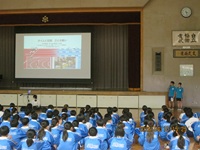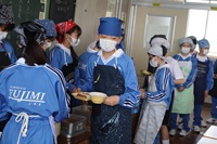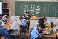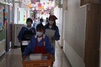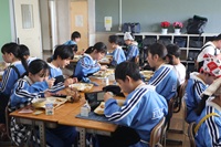 本日から給食が始まります。午前中の学級活動で給食の係決めや約束事の確認などを行いました。1年生にとっては入学後、初めての給食です。校舎1階のコンテナ室から4階の学年フロアまで食缶を運ぶのは大変です。みんなで協力して運搬・配膳し、おいしい給食をいただくことができました。