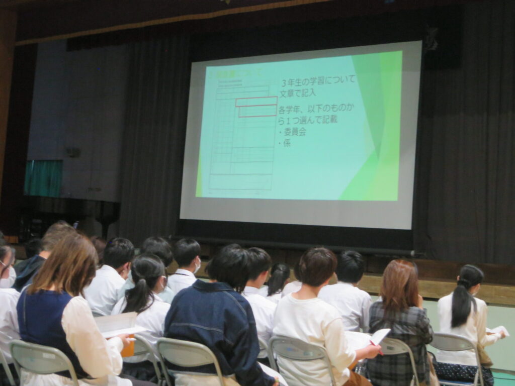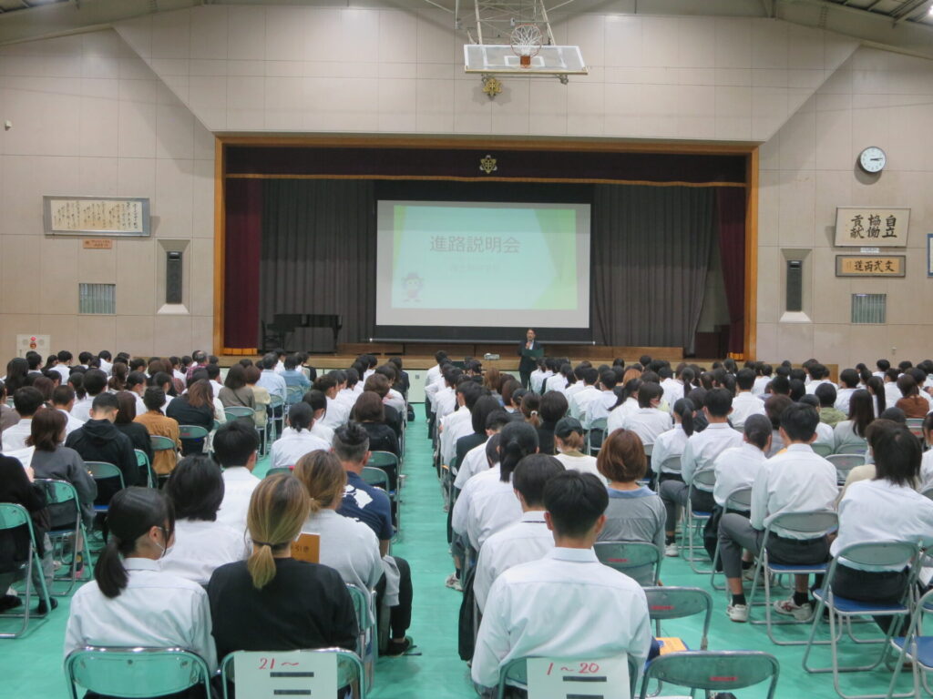 本日、3年生の生徒・保護者対象の進路説明会を本校体育館にて実施しました。配付した「進路の手引き」をもとに、志望校を決定してから、受検(受験)するまでの手続きのことなど、具体的な説明を行いました。今後は、面談も実施します。家庭と学校とがしっかり連携し、生徒の進路選択・決定を支えていきましょう。