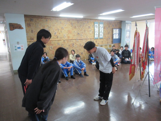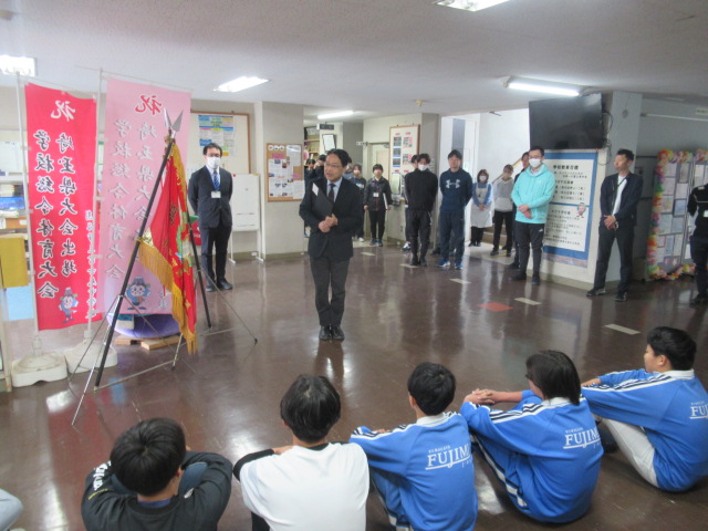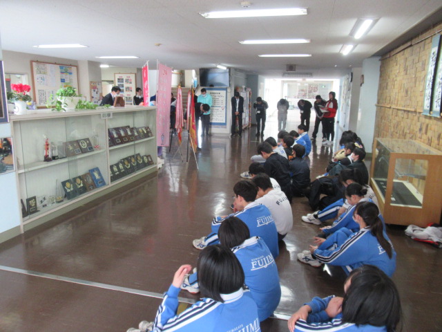 令和8年度がスタートし、本日は2日目。順調な滑り出しです。グラウンドや体育館、校舎内では多くの部が活動し、学校全体に生徒の活気が満ち満ちています。10時からは、部活動の新顧問の発表と顔合わせが行われました。フジミチ2階に集合した各部の部長さんも、心なしか緊張気味です。代表で、部長会長の田中さんがあいさつしました。以下に紹介します。