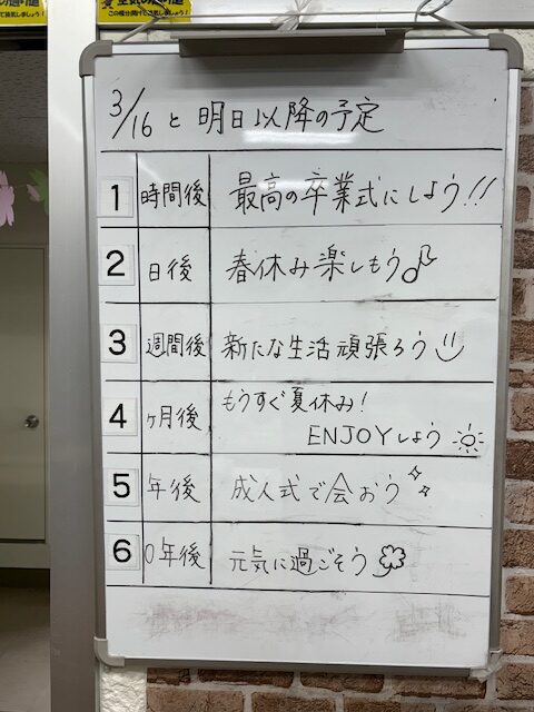 今週の月曜日が卒業式でしたので、修了式までの7日間は1,2年生のみの登校です。2年生は最上級生になる、1年生は中堅学年になる心構えをしっかりつくってほしいです。この7日間の過ごし方はとても重要です。有意義に過ごしましょう。