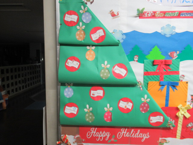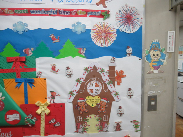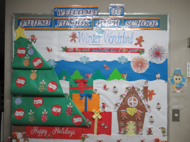 本校のALT二人は、季節ごとにALT専用の掲示板をリニューアルしてくれています。12月といえば、クリスマス。掲示板には、季節にあった英語や生徒たちが学習した表現等を使うことで、生徒たちが興味をもつように作られています。富士見中にお越しの際は是非ご覧ください。