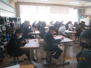 3学年全てが実力テストを実施しました。3年生は入試に備えた実力を、1,2年生はここまでの学習の総復習になります。テストを通して苦手な部分を見つけ、学力をつけてほしいです。